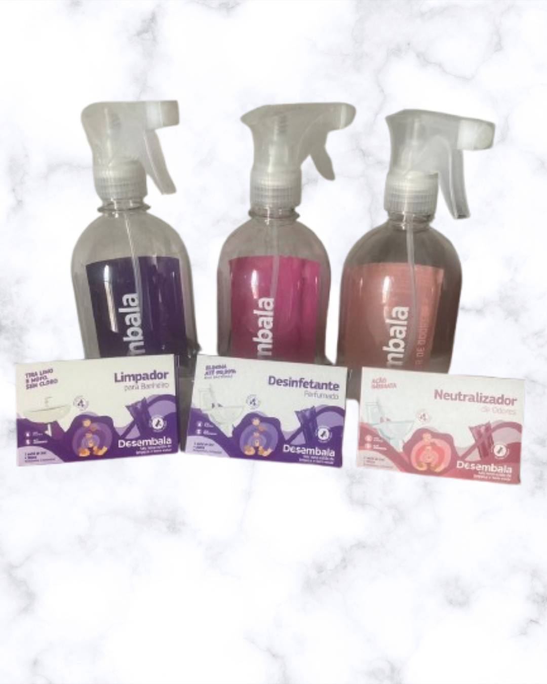 🌿Ele vem com 3 sachês da Desembala: desinfetante, limpador de banheiro e o neutralizador de odores. E mais, três borrifadores vão junto para diluir os produtos em 500 ml e está pronto para usar!
