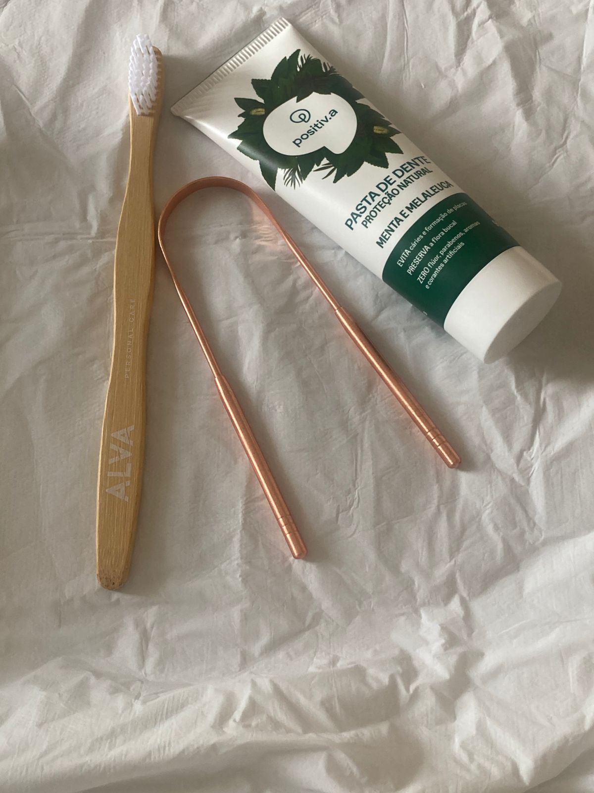 1 escova de dente de bambu - o bambu é biodegradável, tem ação naturalmente antibacteriana e é superconfortável.